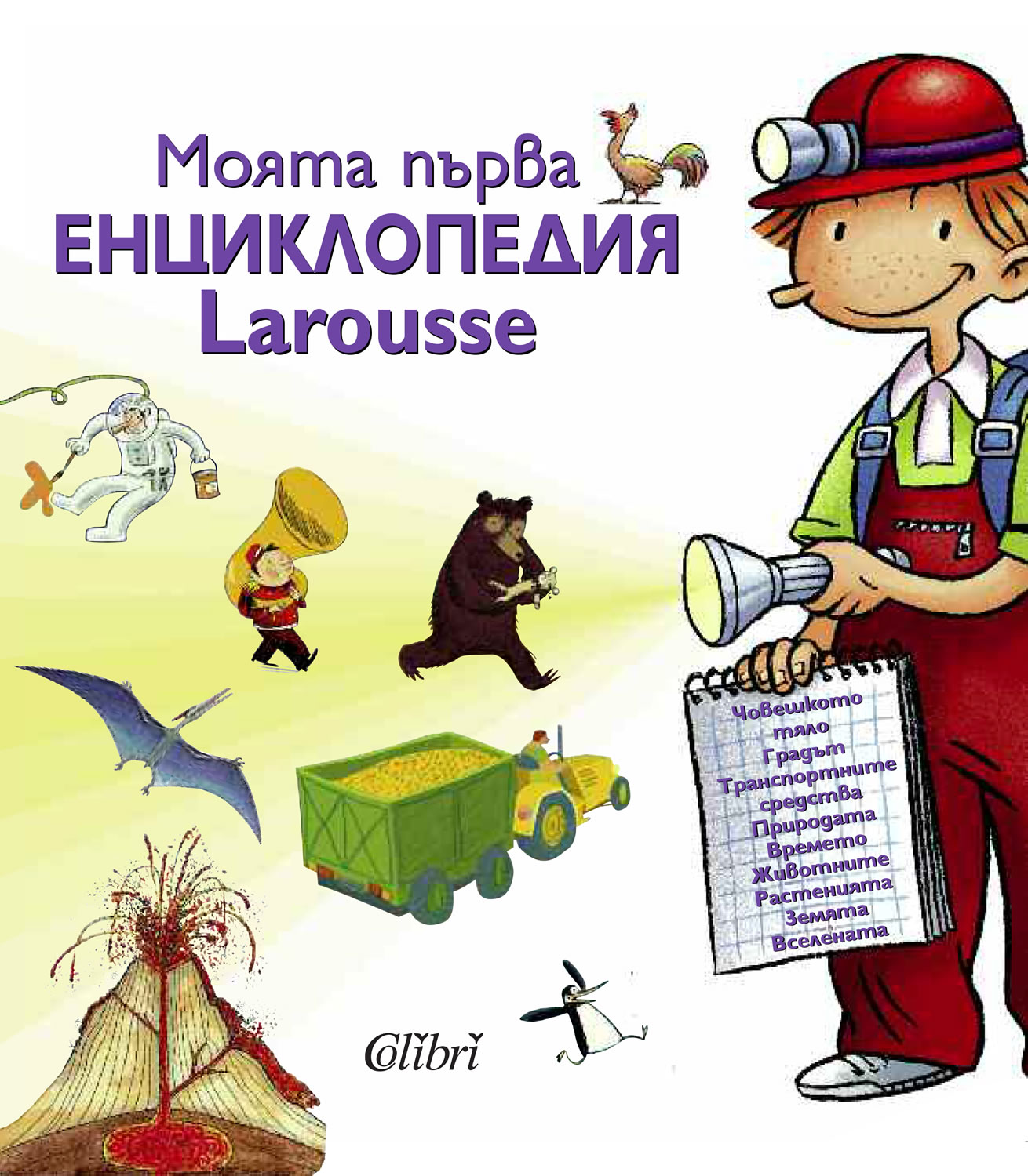 На децата предстои да научат толкова много неща… Моята първа енциклопедия Larousse предлага на любознателните малки читатели отговори на всички въпроси, които те си задават, чрез понятни текстове и весели картинки, пълни със забавни подробности. Можете да разтворите тази книга на която си щете страница. Така като на шега ще откриете как е устроено нашето тяло, ще научите повече за живота в града, за различните транспортни средства, за света на природата, за растенията и животните, за тайните на времето, за планетата Земя и за Вселената.